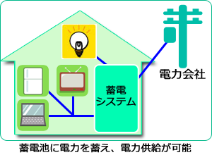蓄電池を備えておくことによって、停電など不測の事態の際に非常用電源として使用したり、深夜など電気料金が安い時間帯に電力を充電しておき、昼間などの電気料金が高い時間帯に照明・テレビ・冷蔵庫など日常生活に必要な電力として利用することが可能です。